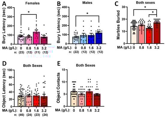 Summary of the effects of a 7-day history of oral MA (0, 0.8, 1.6, or 3.2 g/L) on neophobic-like behavior in tests of marble burying (A–C) and novel-object reactivity (D,E). The data represent the means ± SEMs of the numbers of mice indicated in parentheses. * p < 0.05 for specific dose comparison indicated (Tukey’s tests).