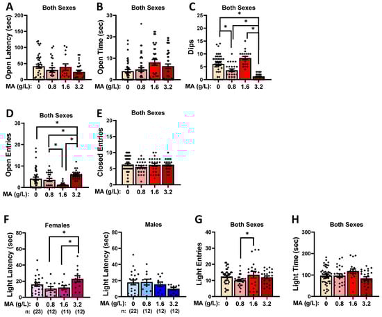 Summary of the effects of a 7-day history of oral MA (0, 0.8, 1.6, or 3.2 g/L) on agoraphobic/photophobic-like behavior in the elevated plus maze (A–E) and dark–light shuttle-box (F–H) tests. The data represent the means ± SEMs of the numbers of mice indicated in parentheses. * p < 0.05 for specific dose comparison indicated (Tukey’s tests).