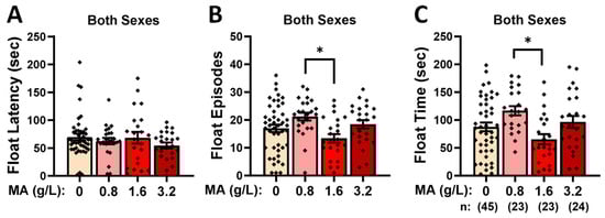 Summary of the effects of a 7-day history of oral MA (0, 0.8, 1.6, or 3.2 g/L) on (A) the latency to first float, (B), the number of floating episodes and (C) the time spent floating in the forced-swim test. The data represent the means ± SEMs of the numbers of mice indicated in parentheses in Panel (C). * p < 0.05 for specific dose comparison indicated (Tukey’s tests).