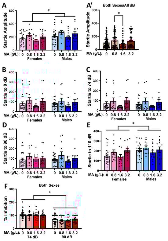 Summary of the effects of a 7-day history of oral MA (0, 0.8, 1.6, or 3.2 g/L) on acoustic startle (A–E) and prepulse inhibition (PPI) of acoustic startle (F). (A) Comparison of the average startle amplitude between male and female mice, with the different MA histories. (A’) Depiction of the main Dose effect for the average startle amplitude across the different acoustic stimuli. Depiction of the startle magnitude in response to the (B) 0 dB, (C) 74 dB, (D) 90 dB, and (E) 110 dB acoustic stimuli. (F) Depiction of the main Prepulse effect on PPI of acoustic startle. The data represent the means ± SEMs of the numbers of mice indicated in Figure 4. * p < 0.05 for specific dose comparison indicated (Tukey’s tests); # p < 0.05 for main effect of sex; + p < 0.05 for main effect of prepulse.