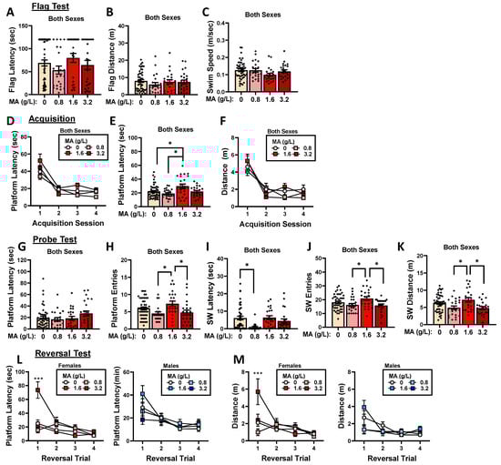 Summary of the effects of a 7-day history of oral MA (0, 0.8, 1.6, or 3.2 g/L) on spatial navigation in the Morris water maze assay, including visually cued navigation during the flag test (A–C), spatial learning during the acquisition phase of the assay (D–F), spatial recall during the probe test (G–K), and the reversal learning of a new platform location (L,M). These data represent the means ± SEMs of the numbers of mice indicated in parentheses in Figure 4. * p < 0.05 for specific dose comparison indicated (Tukey’s tests); *** p < 0.05 vs. three other MA doses (Tukey’s tests).