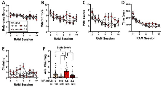 Summary of the effects of a 7-day history of oral MA (0, 0.8, 1.6, or 3.2 g/L) on behavior expressed during radial-arm maze (RAM) training. The data represent the means ± SEMs of the numbers of mice indicated in parentheses in Panel (F). * p < 0.05 for specific dose comparison indicated (Tukey’s tests).