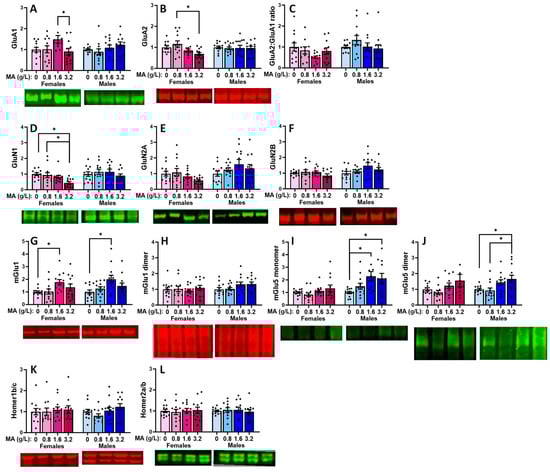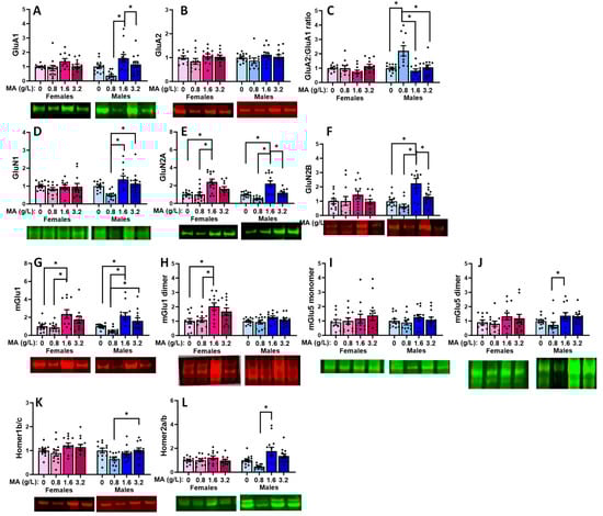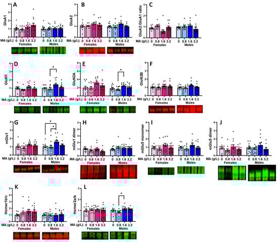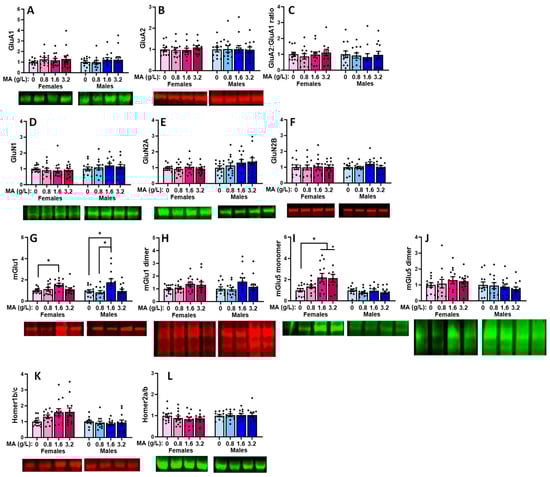 Summary of the effects of a 7-day history of oral MA (0, 0.8, 1.6, or 3.2 g/L) on the expressions of the following glutamate receptor-related proteins within the amygdala: the AMPA receptor subunits (A) GluA1, (B) GluA2, (C) the relative expression of GluA2 to GluA1, the NMDA receptor subunits (D) GluN1, (E) GluN2a, (F) GluN2b, the Group 1 mGlu receptors, (G) mGlu1 (monomer), (H) mGlu1 (dimer); (I) mGlu5 monomer, (J) mGlu5 dimer and the receptor scaffolding proteins, (K) Homer1b/c and (L) Homer2a/b. The data represent the means ± SEMs of 11–12 mice. * p < 0.05 for specific dose comparison indicated (Tukey’s tests).