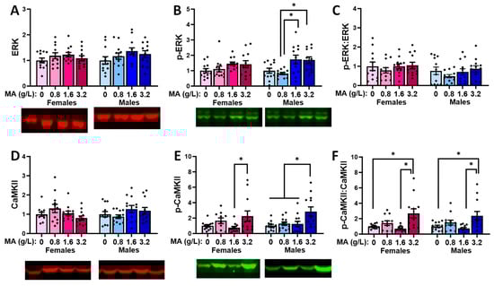 Summary of the effects of a 7-day history of oral MA (0, 0.8, 1.6, or 3.2 g/L) on the expression and phosphorylation state of ERK (A,B) and CaMKII (D,E) within the vPFC. The relative expression of p-ERK to ERK (C) and p-CaMKII to CaMKII (F) are also depicted. The data represent the means ± SEMs of 11–12 mice. * p < 0.05 for specific dose comparison indicated (Tukey’s tests).