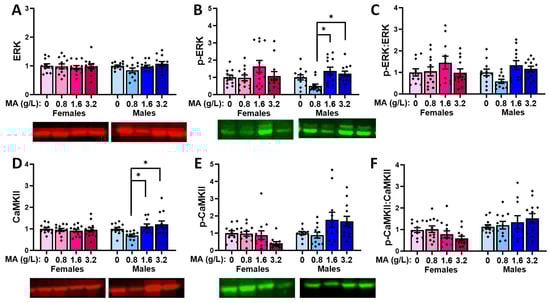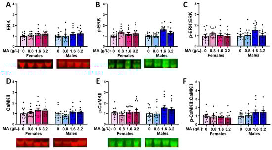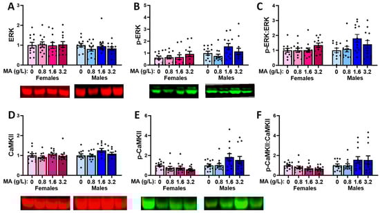Oral MA history did not alter the vmPFC levels of ERK in either sex (Figure 10A; univariate ANOVAs: for females, p = 0.398; for males, p = 0.264). The two highest MA concentrations elevated the p-ERK expression in the males, relative to the MA-0.80 males (Figure 10B) [F(1,47) = 5.820, p = 0.002; Tukey’s tests: p-values < 0.015; other p-values > 0.053], with no MA effect detected in the females (Figure 10B; F(1,47) = 1.759, p = 0.169]. However, when the ratio of the phosphorylated to total ERK expression was considered, we detected no MA effects in either sex (Figure 10C; univariate ANOVAs: for females, p = 0.919; for males, p = 0.425), indicating that a brief history of oral MA intake does not alter the activational state of ERK in the vmPFC. Neither females nor males exhibited changes in the total expression of CaMKII (Figure 10D; univariate ANOVAs: for females, p = 0.124; for males, p = 0.267). However, the highest MA dose elevated the p-CaMKII expression in the males, relative to all the other groups (Figure 10E) [F(1,47) = 5.086, p = 0.004; Tukey’s tests: p-values < 0.026; other p-values > 0.953]. The MA-3.2 females also exhibited higher p-CaMKII expression [F(1,45) = 2.908, p = 0.046], but this effect reflected a difference between the MA-3.2 and MA-1.6 mice only (Figure 10E; Tukey’s tests: p = 0.049; other p-values > 0.129). When the ratio of the phosphorylated to total CaMKII expression was considered (Figure 10F), a more robust dose–effect was apparent for females [F(1,47) = 6.643, p = 0.0001], which reflected a higher relative expression of p-CaMKII in the MA-3.2 females versus the MA-0 (p = 0.006) and MA-1.6 (p = 0.001; for MA-3.2 vs. MA-1.6, p = 0.057) females. In males, the MA effect [F(1.47) = 4.658, p = 0.007] reflected similar group differences (Figure 10F; Tukey’s: MA-3.2 vs. MA-0 mice, p = 0.027; MA-3.2 vs. MA-1.6 mice, p = 0.006; other p-values > 0.250). Thus, in contrast to ERK, a brief history of oral MA self-administration increases the activational state of CaMKII in the vmPFC.