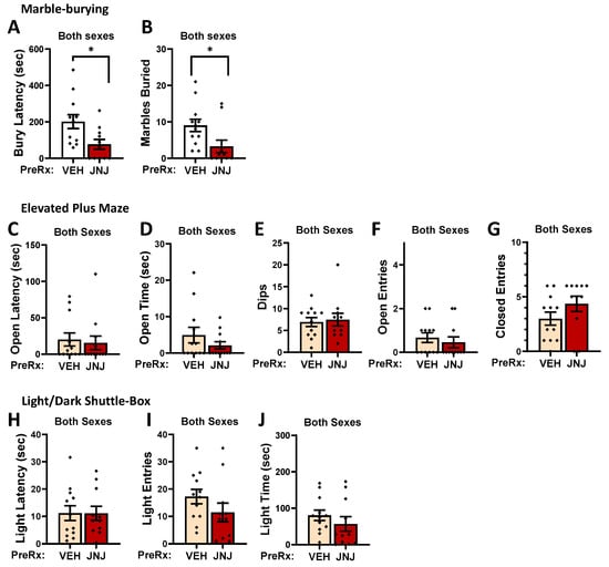 A comparison of the average MA intake exhibited by the mice prior to anxiety testing indicated no group differences (Pretreatment X Sex ANOVA: all p-values > 0.538; for female VEH: 31.52 ± 3.01; for female JNJ: 38.78 ± 9.99; for male VEH: 34.30 ± 5.28; for male JNJ: 37.62 ± 12.95 mg/kg). Thus, we did not detect a sex difference in the MA intake in this follow-up study. Further, no sex differences were detected for any of the anxiety measures as determined by Pretreatment X Sex ANOVAs (p-values > 0.136). Thus, the data were collapsed across the Sex factor for visualization, resulting in final samples sizes of 12 for the VEH-pretreated animals and 11 for the JNJ-pretreated animals. The JNJ pretreatment reduced both the latency to begin burying marbles (Figure 17A) [t(19) = 2.569, p = 0.005] as well as the number of marbles buried by the MA-experienced mice (Figure 17B) [t(19) = 2.012, p = 0.031]. However, no JNJ effects were detected for any of the measures in the elevated plus maze (Figure 17C–G; t-tests: p-values > 0.262) or light–dark shuttle-box (Figure 17H–J; t-tests: p-values > 0.121). These data argue that MA-induced mGlu1 hyperactivity contributes to some aspects of negative affect observed during early MA withdrawal.
