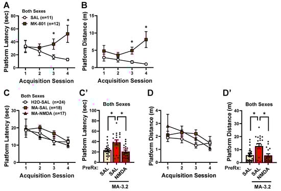 - Moenk, M.D.; Matuszewich, L. Juvenile but not adult methamphetamine exposure improves performance in the Morris Water Maze in male rats. Int. J. Dev. Neurosci. 2012, 30, 325–331. [Google Scholar] [CrossRef]