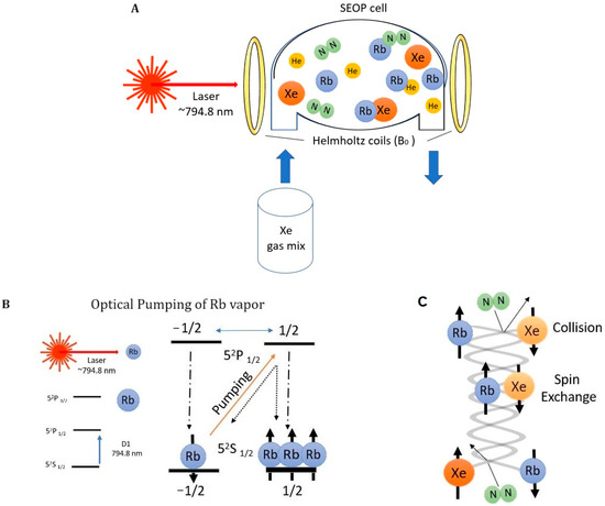 (A) Schematic of 129Xe spin-exchange optical pumping (SEOP) setup using a high-power Rb laser and optical pumping cell with gas mixture of 129Xe, 4He, and N2; (B) the optical pumping of Rb with left-circularly polarized light by D1 transition from the ground state 5 2S1/2 to in the excited state 5 2P1/2; (C) the spin-exchange process between the polarized Rb electron spin and the 129Xe nuclear spin by the hyperfine interaction in two- and three-body collisions. Adapted from Walker and Happer (1997) [62].