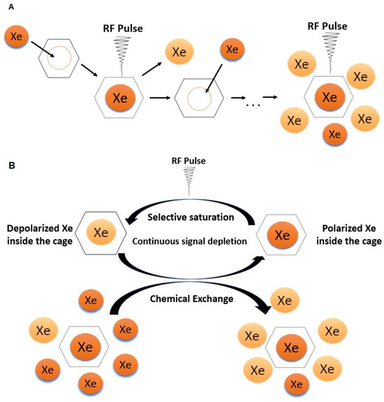 (A) Step-by-step diagram on the HyperCEST mechanism: HP 129Xe from the dissolved pool goes into the cavity of the host unit; after the reversible enclosure within the host, the selective saturation pulse is applied; depolarized 129Xe leaves the cage, and a new HP 129Xe atom from pool A takes over the space; the process continues, and thus, in close proximity to the cage, the number of depolarized xenon atoms is increasing. (B) The process of chemical exchange saturation transfer between saturated HP 129Xe enclosed in a host unit and HP 129Xe from the dissolved pool provides continuous signal depletion in the area in close proximity to the host unit, thus causing a greater loss in the net magnetization. Adapted from Schröder et al. (2006) [28].