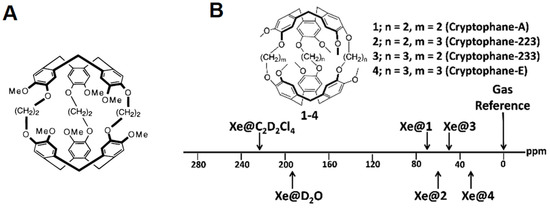 (A) Structure of cryptophane-A. Reproduced with permission from Bartik et al. (1998) [142]. Copyright 2023 American Chemical Society. (B) Chemical structure and 129Xe NMR chemical shifts of cryptophanes with varying alkoxy linker length in 1,1,2,2-tetrachloroethane-d2 (1–4). Adapted from Zemerov and Dmochowski (2021) [147] under the CC BY-NC 3.0 DEED License.