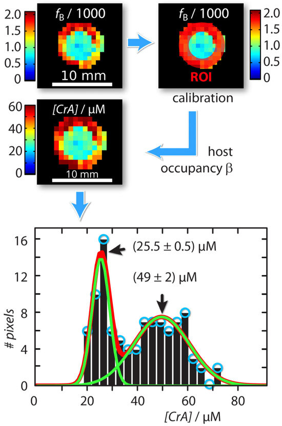 Workflow of absolute concentration mapping starting with the ratio of bound and free Xe,fβ. At the top left: the host occupancy, β, was calibrated with the HyperCEST response produced by the known reference sample in the outer compartment; the unknown CrA-ma concentration in the inner compartment was then calculated utilizing an internal standard. The Gaussian line fitted histogram of the [CrA-ma] map identified two different concentration populations. Reproduced from Kunth and Schröder (2021) [92] under the CC BY 4.0 DEED License.
