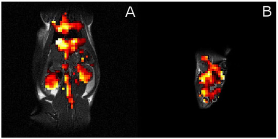 HyperCEST saturation maps of a (A) rat abdomen and (B) rat head, acquired after injection of 10 mM CB6 in PBS. Reproduced from Hane et al. (2017) [100] under a CC BY 4.0 DEED License.