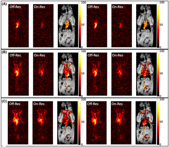 In vivo HyperCEST maps (two sets) obtained after the injection of 0.1 mL 20 mM CB6 in PBS solution into mice following (A) one breath, (B) three breaths, and (C) four breaths of HP 129Xe. Reproduced from McHugh et al. (2022) [102] with permission from John Wiley and Sons and Copyright Clearance Center.