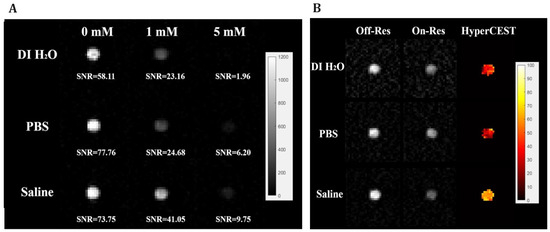 (A) HP 129Xe in control, 1 mM, and 5 mM of R3-Noria-MeSO3H and (B) HyperCEST images in 1 mM of R3-Noria-MeSO3H for DI H2O, PBS, and saline solutions. Reprinted with permission from Shepelytskyi et al. (2023) [204]. Copyright 2023 American Chemical Society.