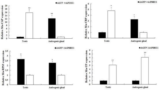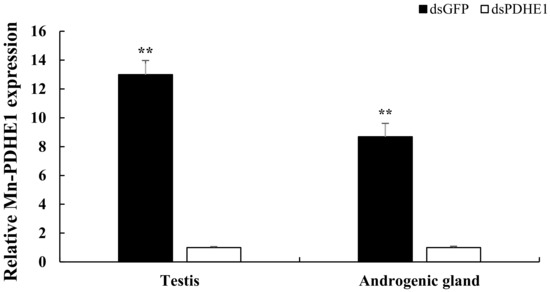 Verification of the efficiency of injected dsPDHE1. Data are shown as means ± SD (standard deviation) of tissues from three biological replicates. ** (p < 0.01) indicated the extremely significant difference of Mn-PDHE1 expressions in the testis and androgenic gland between the dsPDHE1-injected prawns and dsGFP-injected prawns.