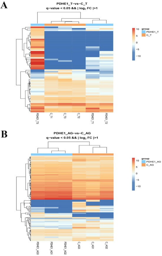 Clustering diagram of DEGs. The horizontal coordinates represent the sample names and the clustering results of the samples while the vertical coordinates represent the DEGs and the clustering results of the DEGs. The colors represent the expression levels of DEGs in the samples. (A) indicates the clustering diagram comparing the testis between the dsPDHE1-injected prawns and dsGFP-injected prawns. (B) indicates the clustering diagram comparing the androgenic gland between the dsPDHE1-injected prawns and dsGFP-injected prawns.