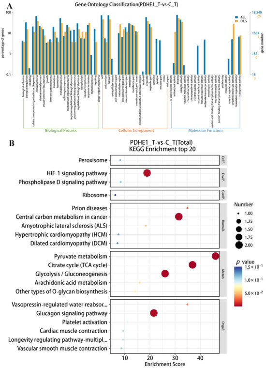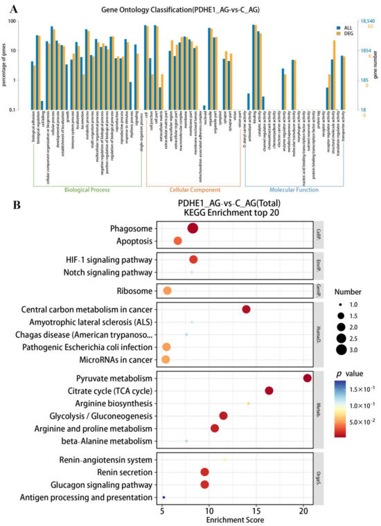 Gene Ontology (GO) analysis and Kyoto Encyclopedia of Genes and Genomes (KEGG) analysis of DEGs in the androgenic gland transcriptome after the injection of dsPDHE1. (A,B) indicate the GO analysis and KEGG analysis of DEGs, respectively.