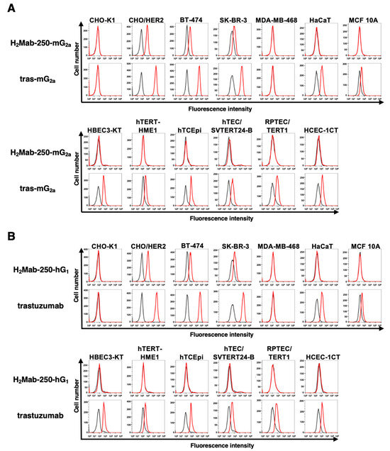 Flow cytometry using anti-HER2 mAbs against HER2-overexpressed cells, breast cancer cell lines, and normal epithelial cell lines. (A) Flow cytometry using H2Mab-250-mG2a (10 μg/mL; red line) and tras-mG2a (10 μg/mL; red line) against CHO-K1, CHO/HER2, HER2-positive breast cancers (BT-474 and SK-BR-3), a triple-negative breast cancer (MDA-MB-468), and spontaneously immortalized normal epithelial cells (HaCaT and MCF 10A), as well as immortalized normal epithelial cells including HBEC3-KT (lung bronchus), hTERT-HME1 (mammary gland), hTCEpi (corneal), hTEC/SVTERT24-B (thymus), RPTEC/TERT1 (kidney proximal tubule), and HCEC-1CT (colon). (B) Flow cytometry using H2Mab-250-hG1 (10 μg/mL; red line) and trastuzumab (10 μg/mL; red line) against the abovementioned cell lines. The cells were treated with Alexa Fluor 488-conjugated anti-mouse IgG or fluorescein (FITC)-conjugated anti-human IgG. The fluorescence data were collected using an SA3800 Cell Analyzer (Sony Corp., Tokyo, Japan), and the data were analyzed using FlowJo v10.8.1. The black line represents the negative control (blocking buffer).