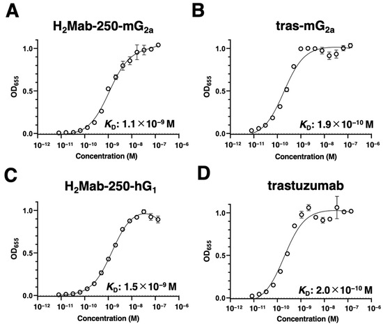 We next evaluated the binding affinity of H2Mab-250-mG2a, H2Mab-250-hG1, tras-mG2a, and trastuzumab to HER2ec by enzyme-linked immunosorbent assay (ELISA). The KD values of H2Mab-250-mG2a and tras-mG2a to HER2ec were determined to be 1.1 × 10−9 M (Figure 2A) and 1.9 × 10−10 M (Figure 2B), respectively. The KD values of H2Mab-250-hG1 and trastuzumab to HER2ec were also determined to be 1.5 × 10−9 M (Figure 2C) and 2.0 × 10−10 M (Figure 2D), respectively. Although the binding affinity of H2Mab-250-mG2a and H2Mab-250-hG1 was less than that of tras-mG2a and trastuzumab, respectively, H2Mab-250-mG2a and H2Mab-250-hG1 exhibited high binding affinity to HER2ec. Furthermore, the changes in the mAb format did not affect the binding affinity compared to the original mAbs [22].