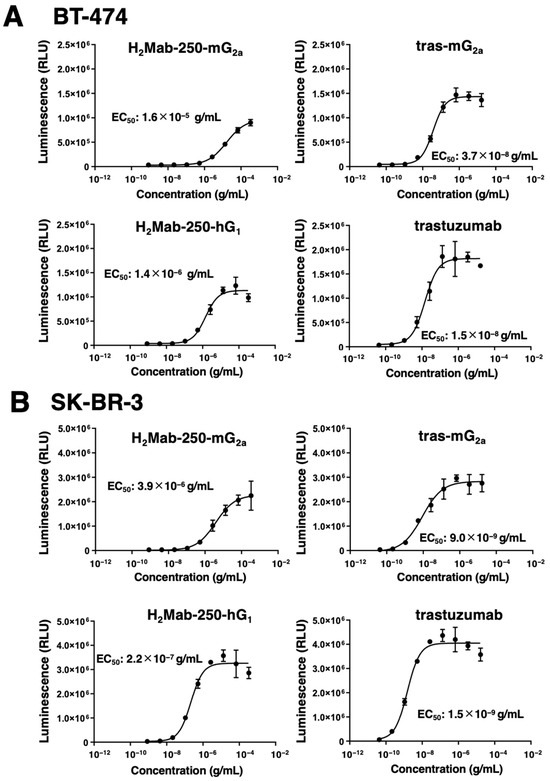 The ADCC reporter assay by H2Mab-250-mG2a, H2Mab-250-hG1, tras-mG2a, and trastuzumab in the presence of BT-474 and SK-BR-3 cells. Target HER2-positive breast cancer cells such as BT-474 (A) or SK-BR-3 (B) were cultured in a 96-well white solid plate. H2Mab-250-mG2a, H2Mab-250-hG1, tras-mG2a, and trastuzumab were serially diluted and added to the target cells (n = 3). The engineered Jurkat cells were then added and co-cultured with antibody-treated target cells. Luminescence using the Bio-Glo Luciferase Assay System was measured using a GloMax luminometer (Promega Corporation, Madison, WI, USA). Values are presented as the mean ± SD. The EC50 was calculated using GraphPad PRISM 6.