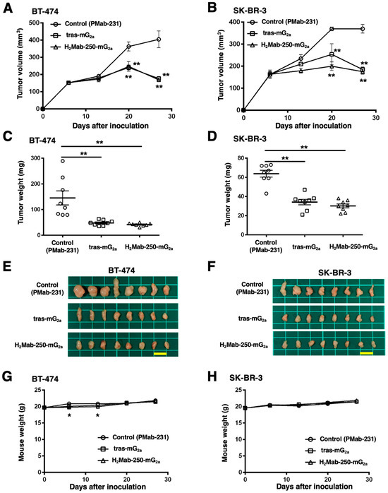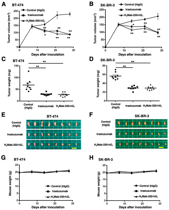 The body weight loss was not observed in H2Mab-250-hG1- and trastuzumab-treated BT-474 and SK-BR-3 xenograft-bearing mice (Figure 6G,H).