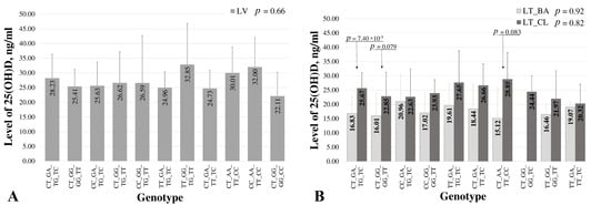 2.2. Analysis of Serum 25(OH)D Levels in Case/Control Study among the LT and LV Populations
