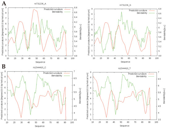 2.6. Effects of Polymorphism Sequence Changes on DNA Bends and Overall DNA Structure