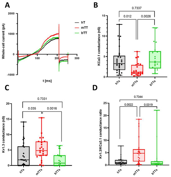 On the other hand, we determined the ratio of Kv1.3 and KCa3.1 conductance to map the cell-by-cell variance in these channels’ level (Figure 1D). As shown in Figure 1D, mTTs show a KCa3.1lowKv1.3high phenotype, while hTs and bTTs were typically KCa3.1high and Kv1.3low (p values are 0.0022 between hTs and mTTs, 0.0319 between bTTs and mTTs).