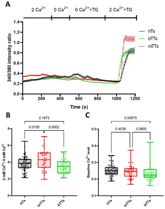 Thapsigargin-evoked Ca2+ response of mTTs is higher than for hTs and bTTs. (A) TG-induced Ca2+ response of hTs, mTTs and bTTs. Data points represent the average of 340 nm/380 nm intensity ratio of FURA-2 for several cells. (B) Box-plot of 2 Ca2+/0 Ca2+ intensity ratios for hTs, mTTs and bTTs. Each point represents a single-cell value. p values are indicated over the bars. (C) Box-plot of baseline Ca2+ intensity ratios for hTs, mTTs and bTTs. Each point represents a single-cell value.
