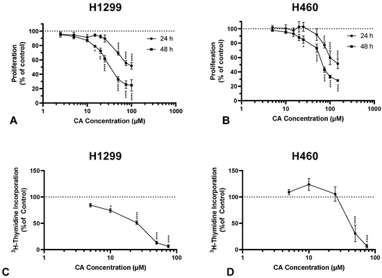In addition, CA treatment dose-dependently inhibited the proliferation of H460 cells, with an IC50 of 89.6 µM and 67 µM for 24 h and 48 h, respectively (Figure 1B). The maximum inhibition of 3H-thymidine incorporation in H460 cells was observed with 50 µM CA (30.77 ± 15.73% of control, p < 0.0001; Figure 1D).