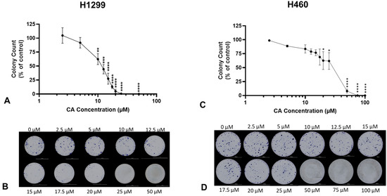 Clonogenic survival assays were performed as described previously [17]. H1299 or H460 cells were seeded in duplicate in 12-well plates (500 cells/well), allowed to adhere overnight, and exposed to media containing the indicated concentrations of CA for 7 days. Colonies were fixed with 10% formalin and stained with 0.5% (w/v) crystal violet; representative images were taken using a BioTek Cytation5 plate reader. Colonies (>50 cells) were counted, and the data were expressed as the surviving fraction compared to the control.