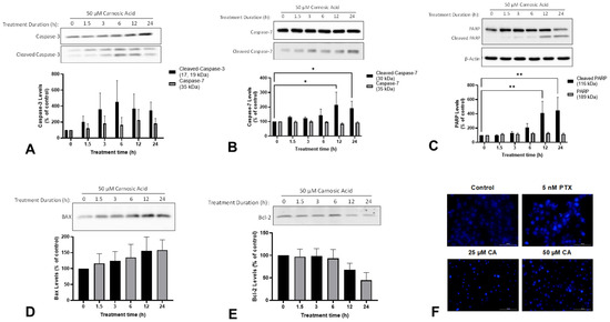 The evasion of apoptosis is another characteristic of cancer cells that contributes to increased proliferation and survival. During apoptosis, proapoptotic Bcl-2-associated X protein (BAX) neutralizes antiapoptotic B-cell lymphoma 2 (Bcl-2) leading to the release of apoptogenic factors from mitochondria. These factors lead to activation of caspase-3 and caspase-7 which promote apoptosis through proteolytic cleavage and the inactivation of proteins necessary for survival such as poly (ADP-ribose) polymerase (PARP). The treatment of H1299 cells with 50 µM CA for 12 h or 24 h significantly increased the levels of cleaved caspase-7 (12 h: 214.8 ± 87.3%, p < 0.05; 24 h: 191.7 ± 48.0%, p < 0.05; Figure 3A) and cleaved PARP (12 h: 410.3 ± 163.9%, p < 0.01; 24 h: 447.9 ± 183.5%, p < 0.01; Figure 3B). Additionally, there was a trend toward increased levels of cleaved caspase-3 and BAX, and decreased levels of Bcl-2 (Figure 3A,D,E).