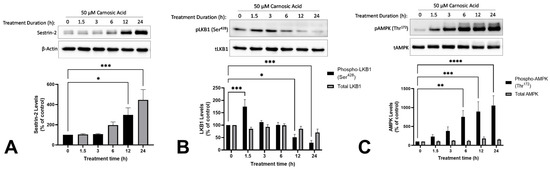 Carnosic acid (CA) increases Sestrin-2 (A), phospho-LKB1 (B), and phospho-AMPK (C) in H1299 NSCLC cells. Whole cell lysates were prepared from H1299 cells treated without (control) or with 50 µM CA for 1.5–24 h. Cell lysates (20 µg) were resolved by SDS-PAGE and immunoblotted with specific antibodies against sestrin-2 (A), β-actin (A), total and phospho-LKB1 (Ser428; B), or total and phospho-AMPK (Thr172; C). Upper panel: A representative immunoblot is shown. Lower panel: The densitometry of the bands, expressed in arbitrary units was measured using ImageJ 1.54 g software. The data are expressed as percent of control and are the mean ± SEM of six separate experiments. * p < 0.05, ** p < 0.01, *** p < 0.001, **** p < 0.0001, compared to control.