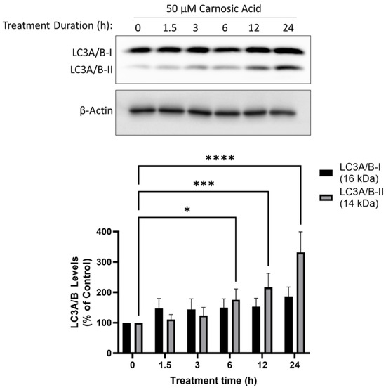 Carnosic acid (CA) induces autophagy in H1299 NSCLC cells. Whole cell lysates were prepared from H1299 cells treated without (control) or with 50 µM CA for 1.5–24 h. Cell lysates (20 µg) were resolved by SDS-PAGE and immunoblotted with specific antibodies against LC3A/B or β-actin. Upper panel: A representative immunoblot is shown. Lower panel: The densitometry of the bands, expressed in arbitrary units was measured using ImageJ 1.54g software. The data are expressed as percent of control and are the mean ± SEM of six separate experiments. * p< 0.05, *** p < 0.001, **** p < 0.0001, compared to control.