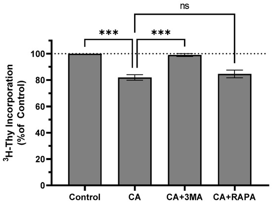 To determine whether CA-induced autophagy was cytoprotective or antiproliferative, cells were treated with 10 µM CA in the presence of the autophagy inhibitor 3-methyladenine (3MA) or the autophagy activator rapamycin (RAPA). CA alone decreased thymidine incorporation to 82.00 ± 2.08% of control (p < 0.01 vs. control), and pre-treatment with 3MA blocked the effect of CA (99.00 ± 1.16% of control; p < 0.01 vs. CA). Pre-treatment with RAPA did not alter the effect of CA (84.67 ± 2.91% of control, p = 0.7187 vs. control; Figure 6). 3MA or RAPA alone did not affect 3H-thymidine incorporation (Figure S1).
