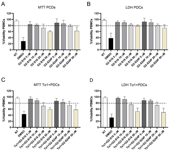 The biocompatibility analysis of G2-S16 and G2-S24P dendrimers in peripheral blood mononuclear cell (PBMC) cultures was conducted by MTT and LDH assays in treatments with increasing concentrations (5, 10, 20, and 50 µM) for 48 h (Figure 1). Concentrations where cell viability exceeded 80% were considered non-toxic in comparison to the non-treated condition [19]. The results demonstrated that G2-S16 and G2-S24P dendrimers exhibit good biocompatibility at concentrations of 5 and 10 μM, with cell viability values ranging between 80–85% for both MTT and LDH assays. The MTT and LDH results indicated that treatments with G2-S16 and G2-S24P PCDs for 48 h cause a dose-dependent reduction in mitochondrial activity but do not cause any damage in PBMC membranes categorical of cell death. Similar results were observed when MTT and LDH biocompatibility analyses were performed on Tα1 + PCDs co-treatments.