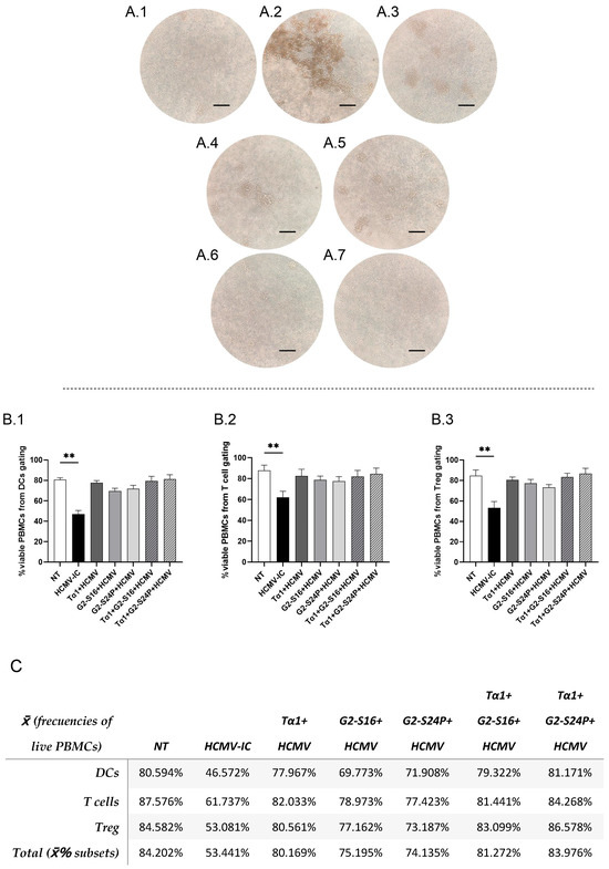 Representative microscopy images and viability of PBMCs in HCMV infection. PBMCs (300,000 cells) were pre-treated with Tα1, PCDs and their combinations, infected with HCMV for 2 h later and then cultured for 48 h in culture medium at 37 °C/5% CO2. Then, microscopy images were taken on a DMIL Leica microscope at 4X augmentation. NT: Non-treated control (A.1); HCMV-IC: HCMV Infection control (A.2); Tα1 + HCMV: Tα1 treated and HCMV infected condition (A.3); G2-S24P + HCMV: G2-S24P treated and HCMV infected condition (A.4); Tα1 + G2-S24P + HCMV: Tα1 + G2-S24P treated and HCMV infected condition (A.5); G2-S16 + HCMV: G2-S16 treated and HCMV infected condition (A.6); Tα1 + G2-S16 + HCMV: Tα1 + G2-S16 treated and HCMV infected condition (A.7). Bar graphs represent percentage of live PBMCs from total of events analyzed from DCs (B.1), T cells (B.2) and Treg (B.3) flow cytometry panels in the different study conditions. Table (C) resumes data shown in bar graphs, and the total percentage of viable PBMCs calculated as the average of the viability percentages of each cell population. The mean values (mean ± SD) of at least three independent experiments are shown (** p ≤ 0.01). Abbreviations: DCs: Dendritic cells; PBMCs: Peripheral Blood Mononuclear Cells; PCDs: polyanionic carbosilane dendrimers; HCMV: Human Cytomegalovirus, Tα1: Thymosin-alpha-1; Treg: regulatory T cells.