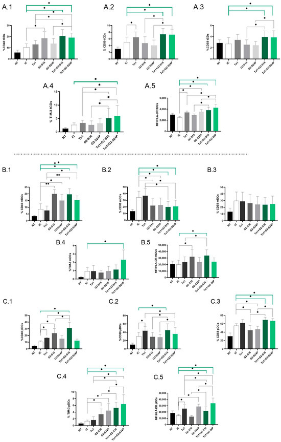 Analysis of total dendritic cells (tDCs) revealed a significant increase in CD40 expression in both Tα1 + PCDs treatments compared to HCMV-IC. Notably, Tα1 + PCDs treatments showed elevated CD40 expression with respect to Tα1 alone, as well as an increased expression between Tα1 + G2-S24P treatment and G2-S24P alone. Moreover, higher CD40 expression was observed in G2-S16 treatment compared to HCMV-IC (Figure 3(A.1)). CD80 expression exhibited a similar trend, with both Tα1 + PCDs treatments showing increased levels compared to HCMV-IC and compared to each PCD treatment alone. Moreover, Tα1 alone demonstrated elevated CD80 expression compared to HCMV-IC (Figure 3(A.2)). Similar results were observed in CD58 expression (Figure 3(A.3)). Furthermore, TIM-3 expression was notably increased in the Tα1 + G2-S24P treatment compared to HCMV-IC and increased levels were observed between Tα1 + PCDs treatments and each individual Tα1, G2-S16 or G2-S24P treatment (Figure 3(A.4)). Additionally, increased HLA-DR MFI level was noted in both Tα1 + PCDs treatments, in G2-S24P alone and in Tα1 treatment compared to HCMV-IC. Similarly, an increase in HLA-DR MFI was observed between Tα1 + PCDs treatments and each PCD treatment alone, and between Tα1 + G2-S24P treatment and Tα1 alone (Figure 3(A.5)). No further changes were observed in tDCs for any studied marker and for HLA-DR MFI.