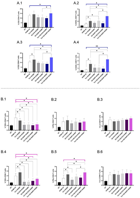 Regarding CD8+ T cells, a significant increase in CD2 expression was observed for Tα1+ G2-S24P compared to HCMV-IC. In addition, increased expression was noted in both Tα1 + PCDs treatments compared to Tα1 alone, as well as between Tα1 + G2-S24P treatment and G2-S24P alone. Moreover, Tα1 exhibited increased CD2 expression compared to HCMV-IC (Figure 4(A.3)). Similar results were observed in CD40L expression (Figure 4(A.4)). No further changes were observed in any treatment condition.