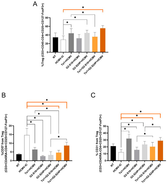 The results demonstrated a significant increase in Treg frequency with Tα1 + G2-S24P treatment, Tα1, and G2-S24P alone compared to HCMV-IC, while a decrease was observed with Tα1 + G2-S16 treatment compared to Tα1. Furthermore, both Tα1 and G2-S24P treatments exhibited higher Treg frequency than HCMV-IC (Figure 5A). Conversely, a significant decreased CD57 expression was evident with both Tα1+ PCDs treatments and with each individual Tα1, G2-S16 and G2-S24P treatment compared to HCMV-IC. Additionally, reduced CD57 expression was observed in Tα1 + G2-S16 treatment compared to Tα1 alone; however, higher CD57 expression was observed in Tα1 + G2-S24P treatment compared to G2-S24P alone (Figure 5B). Furthermore, significantly increased CD31 expression was noted with both Tα1+ PCDs treatments and with each individual Tα1, G2-S16 and G2-S24P treatment compared to HCMV-IC. Finally, higher expression CD31 levels were also observed in Tα1 + PCDs treatments compared to each PCD treatment alone (Figure 5C). These findings suggest that the combination of Tα1 with PCDs enhances Treg functionality while reducing senescence.