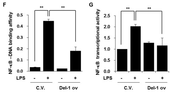 2.5. Del-1 Decreased the Levels of Phospho-p65, NF-kB-DNA Binding Affinity, and NF-κB Transcriptional Activity