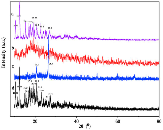 The XRD is presented in Figure 3. The β-CD monomer was crystalline, and its main diffraction peaks appeared at 10.68°, 12.4°, 15.4°, 17.74°, 19.46°, 20.8°, 22.8°, 27.2° (Figure 3a) [37,38]. In contrast, the XRD spectrum of β-CD polymer had undergone significant changes, with a decrease in diffraction intensity and a change in peak shape from a sharp peak to a diffuse peak, indicating that the crystal of β-CD was destroyed and transformed into semi-crystalline or amorphous after polymerization (Figure 3b) [39]. The main component of the original micro-ceramic ball was Al2O3, with its main diffraction peaks at 20.7° and 26.4° (Figure 3c) [40]. β-CD polymer loaded micro-ceramic balls exhibited significant diffraction peaks at 10.68°, 12.45°, 15.2°, 16.0°, 17.5°, 19.46°, 20.7°, 21.4°, 23.0°, 26.4°, and 27.4°, and with a peak envelope, indicating that the micro-ceramic balls adsorb the β-CD polymer (Figure 3d).