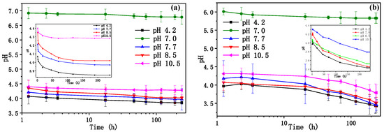 The pH values of β-CD polymer solutions as a function of time during degradation with different initial pH values (pH = 2.24, 4.22, 6.70, 7.41, 8.54, 10.50), at different temperatures of 25 °C (a) and 35 °C (b).