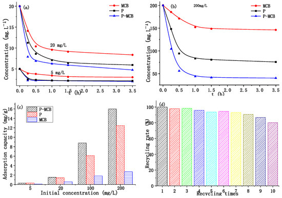 The adsorption capacity of the P-MCB, MCB, and polymer were evaluated, and the adsorption capacities of P-MCB, MCB and polymer were compared under different concentrations (5 mg/L, 20 mg/L, 200 mg/L) (Figure 8a,b). The adsorption of P-MCB, polymer, and MCB in the flutriafol solution with an initial concentration of 200 mg/L in 3.5 h was 15.98 mg/g, 12.44 mg/g, and 2.69 mg/g, respectively (Figure 8c). The adsorption capacity of P-MCB in 20 min was close to that of the Polymer in 1 h. The results indicated P-MCB group had a larger adsorption capacity and higher adsorption efficiency.