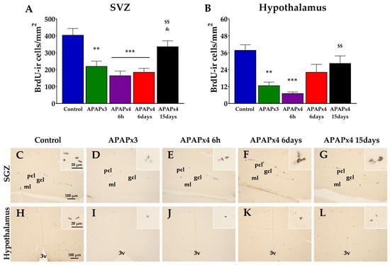 Interestingly, a significant increase in the number of BrdU-ir cells was detected in the hypothalamus of mice that received APAP for 4 consecutive days and were sacrificed 15 days after the last administration (APAPx4–15 days) compared with the APAPx4–6 h group ($$ p < 0.01; Figure 1B,L).