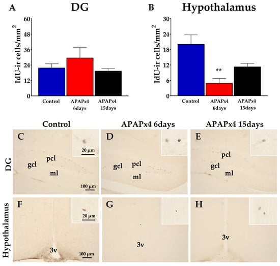 One-way ANOVA showed the effect of APAP administration on cell survival in the hypothalamus (p < 0.01) but not in the dentate gyrus (DG) (Figure 2). The DG of mice repeatedly treated with APAP did not show any difference in the number of IdU-ir cells compared with that of the control mice (Figure 2A,C–E). However, we observed a significant decrease in the number of IdU-ir cells specifically in the hypothalamus of APAPx4-treated mice sacrificed 6 days after the last APAP administration compared with the control group (** p < 0.01; Figure 2B,G).
