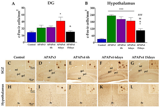 Regarding the hypothalamus, we observed a higher number of c-Fos-ir cells in the APAPx3, APAPx4–6 h, APAPx4–6 days, and APAPx4–15 days groups than in the control group (*** p < 0.001; Figure 3B,I–K). Interestingly, APAPx4-treated mice sacrificed 15 days after the last administration showed a lower c-Fos-ir cell number than that of the other groups treated with repeated APAP administration (APAPx3, APAPx4–6 h, and APAPx4–6 days) (&/$$/### p < 0.05/0.01/0.001; Figure 3B,L).
