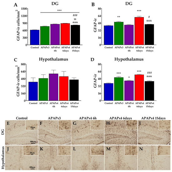 Effect of repeated administration of acetaminophen (APAP) at a dose of 750 mg/kg/day on astrogliosis analyzed by glial fibrillary acidic protein (GFAP) immunohistochemistry in the dentate gyrus (DG) of the hippocampus (A,B) and the hypothalamus (C,D) of male mice. The histogram represents the means ± standard error of the mean (SEM) per section of GFAP immunoreactivity (GFAP-ir) cells and GFAP-ir intensity (n = 6 samples per group). Representative micrographs show magnification views of GFAP-ir cells and GFAP-ir intensity in the DG (E–I) and hypothalamus (J–N). One-way ANOVA: (*) p < 0.05, (**) p < 0.01, and (***) p < 0.001 vs. control group. (#) p < 0.05 and (###) p < 0.001 vs. APAPx3 group. ($$) p < 0.01 vs. APAPx4–6 h group. (&&&) p < 0.001 vs. APAPx4–6 days group.