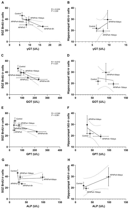 Correlation analysis between plasma levels of liver transaminases gamma-glutamyltransferase (γGT; A,B), aspartate aminotransferase (GOT; C,D), alanine aminotransferase (GPT; E,F), and alkaline phosphatase (ALP; G,H) and cell proliferation in the subgranular zone (SGZ), assessed by the number of 5′-bromo-2′-deoxyuridine immunoreactivity (BrdU-ir) cells, and cell survival in the hippocampus, assessed by the number 5′-bromo-2′-deoxyuridine immunoreactivity (IdU-ir) cells, in mice that received vehicle (control group) or acetaminophen (APAP) at a dose of 750 mg/kg for 3 and 4 consecutive days and that were sacrificed 6 h (APAPx3 and APAPx4–6 h groups), 6 days (APAPx4–6 days group), and 15 days (APAPx4–15 days group) after the last administration. The scatter (XY) plots represent the means ± standard error of the mean (SEM) (N = 6 per experimental group). Plotted (solid) lines between mean points represent the correlative changes between the two variables represented. Dashed lines represent error of the plotted lines. Rho values (goodness-of-fit) were calculated. A p-value less than 0.05 indicates the statistical significance of the correlation.