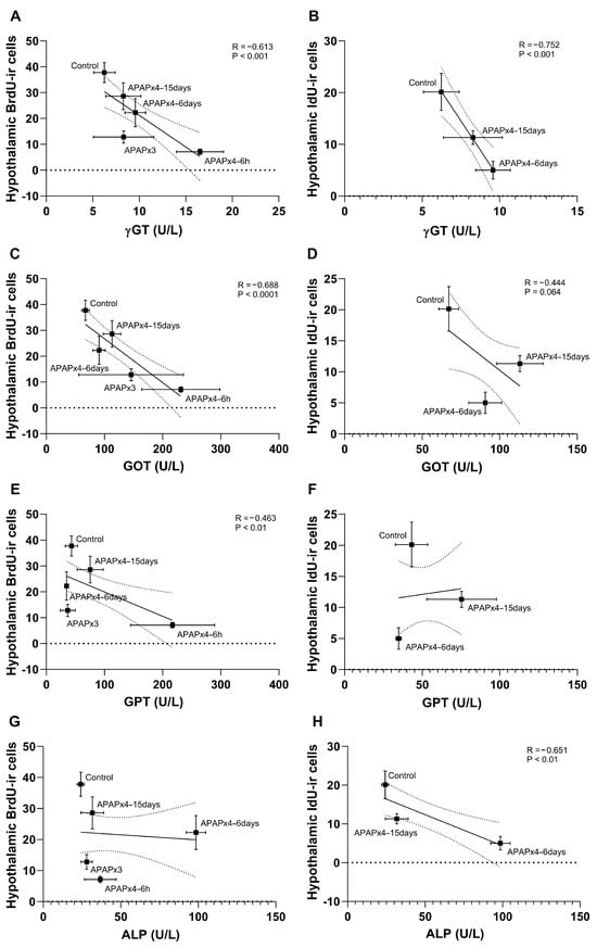 Correlation analysis between plasma levels of the liver transaminases gamma-glutamyltransferase (γGT; A,B), aspartate aminotransferase (GOT; C,D), alanine aminotransferase (GPT; E,F), and alkaline phosphatase (ALP; G,H) and cell proliferation, assessed by the number of 5′-bromo-2′-deoxyuridine immunoreactivity (BrdU-ir) cells, and cell survival, assessed by the number of 5′-iodo-2′-deoxyuridine immunoreactivity (IdU-ir) cells, in the hypothalamus of mice that received saline (control group) or acetaminophen (APAP) at a dose of 750 mg/kg for 3 and 4 consecutive days and that were sacrificed 6 h (APAPx3 and APAPx4–6 h groups), 6 days (APAPx4–6 days group), and 15 days (APAPx4–15 days group) after the last administration. The scatter (XY) plots represent the means ± standard error of the mean (SEM) (N = 6 per experimental group). Plotted (solid) lines between mean points represent the correlative changes between the two variables represented. Dashed lines represent error of the plotted lines. Rho values (goodness-of-fit) were calculated. A p-value less than 0.05 indicates the statistical significance of the correlation.